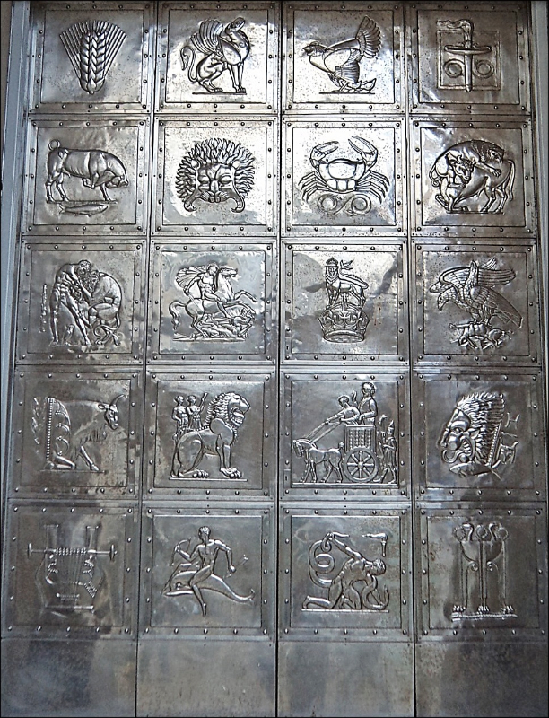 Walter did his designs of the roundels with complex imagery. One is of a flying eagle over an aeroplane propeller, a falling star or comet, gears, a steering wheel and a laurel leaf. Another is a side view of a winged head of Mercury, with stylised sound waves emerging from his mouth and others going into the ear, with a telephone and two stars. The other roundel, of the same size, it has a bicycle chain running around the outside with a Micrometer, an eye, a hand with a pencil and three drill bits, symbolises Coventry’s engineering heritage.